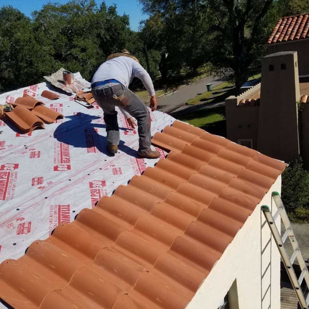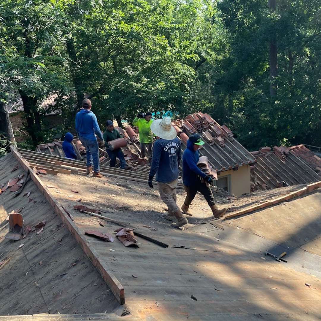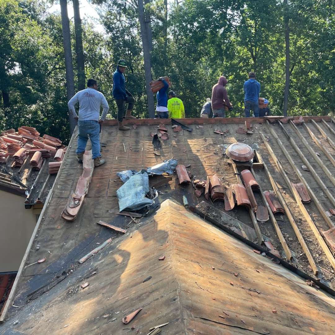 This image captures the process of Tile Roof Replacement in Houston, TX, highlighting the careful removal of broken and worn tiles.